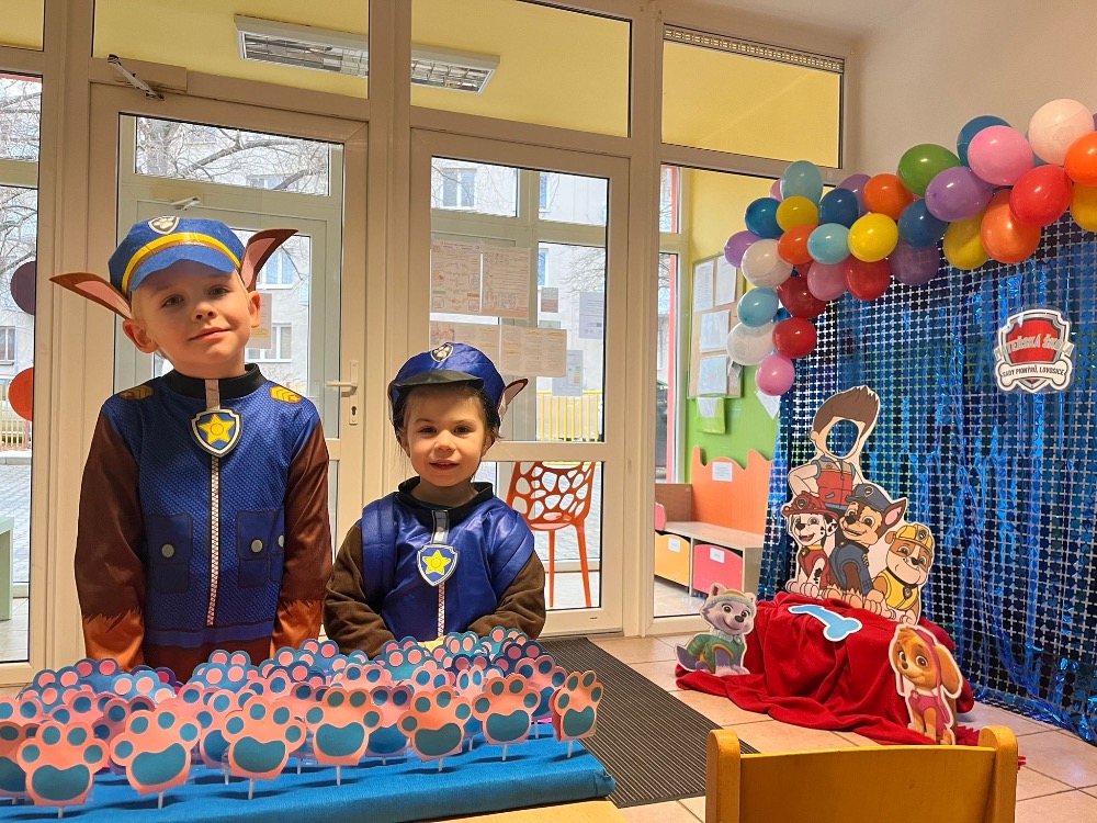 Den otevřených dveří se v naší MŠ letos nesl v duchu oblíbené pohádky Tlapková patrola. Při vstupu do školky vítali přicházející děti a rodiče maskoti – hrdinové z Tlapkové patroly, za kterými se skrývaly naše šikovné děti. Po předání dárku, kartičky s motivy této pohádky a společné fotografie se rodiče s dětmi vydali na obchůzku jednotlivých tříd.