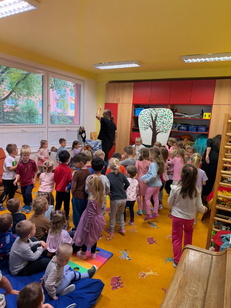 Ve čtvrtek 9. října dopoledne k nám opět zavítalo divadélko Ondřej s písničkami a tanci inspirovanými lidovými zvyky v průběhu roku. Děti se s nadšením zapojily do představení a zahrály si spolu s herci, naučily se nová říkadla, písničky a tance.